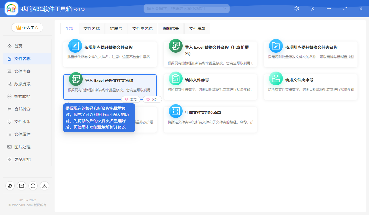 我们打开「我的ABC软件工具箱」,按下图所示选择「文件名称」-「导入 Excel 替换文件夹名称」的功能。