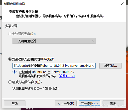 选择中间的选项“安装程序光盘映像文件(iso)(M):”,然后点击右侧“浏览”,从之前下载镜像文件的文件夹中选中压缩包点击确定即可(压缩包不要解压,我当初因为解压而搜索不到 .iso 结尾的文件,好一番折腾),确认后点击“下一步”