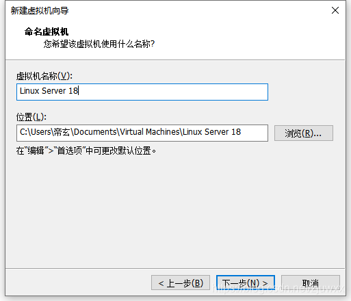 输入“虚拟机名称(V):”,“位置(L):”可以选择默认,也可以点击“浏览”安装到自己选定的文件夹,然后点击“下一步”