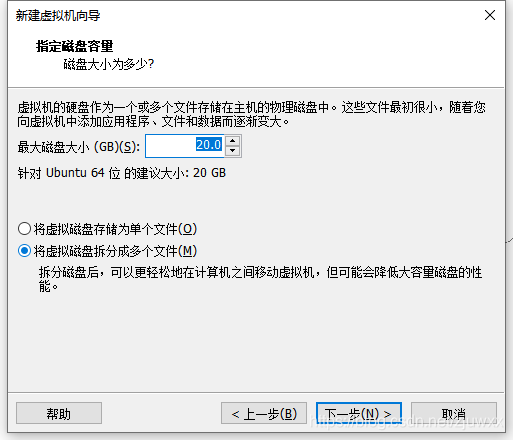直接点击“下一步”,也可以根据需要改变“最大磁盘大小(GB)(S):”,将虚拟磁盘设定为单个文件或多个文件