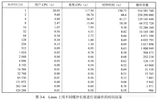 大多数文件系统为改善性能都采用某种预读技术。当检测到正在进行顺序读取时,系统就是图读入比应用要求更多的数据,并假想应用很快就会读这些数据。预读的效果从下图可以看出,缓冲区长度小至32字节时的时钟时间与拥有较大缓冲区长度时的时钟时间几乎一样。
