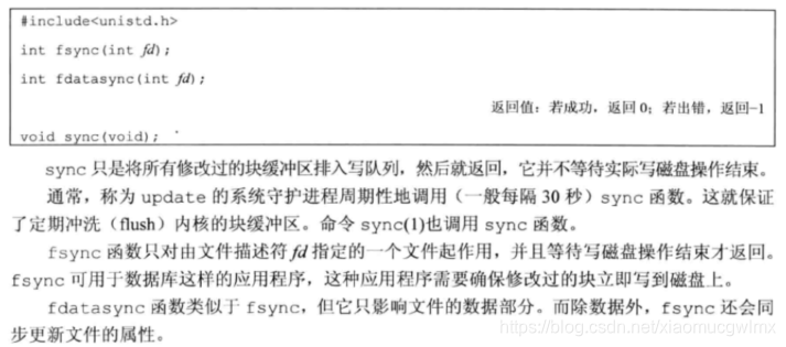 通常,当内核需要重用缓冲区来存放其他磁盘快数据时,会把所有延迟写数据块写入磁盘。为了保证磁盘上实际文件系统和缓冲区中内容的一致性,UNIX提供了sync、fsync和fdatasync三个函数。