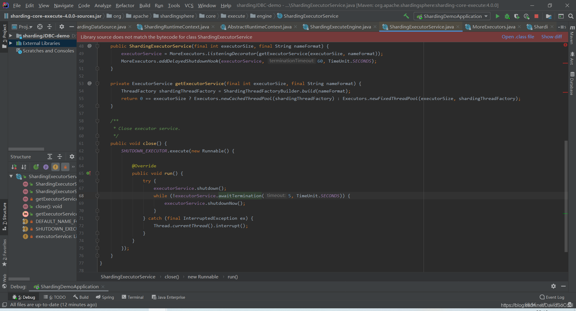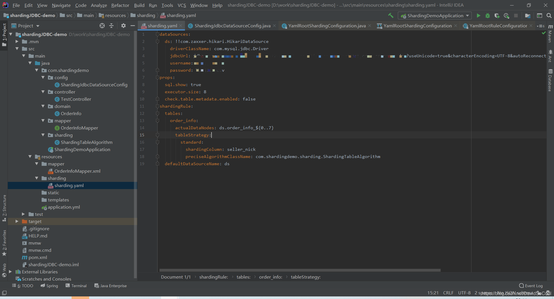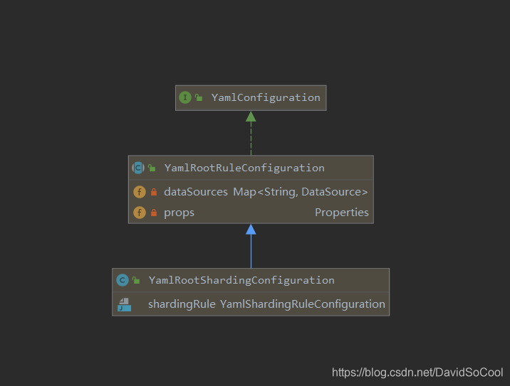 YamlRootShardingConfiguration config = YamlEngine.unmarshal(yamlFile, YamlRootShardingConfiguration.class);查看 YamlRootShardingConfiguration 基本有配置有以下属性:dataSources、shardingRule、props;