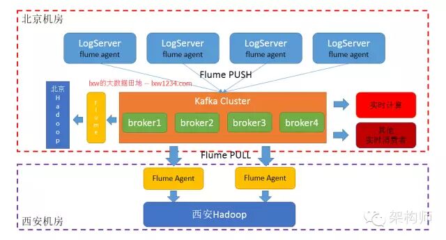 后来,根据业务需要,我们有了两个Hadoop集群,并且部署在不同的地方(北京和西安),而所有的日志收集服务器在北京,因此需要将日志数据通过外网传输到西安,于是有了这样的部署: