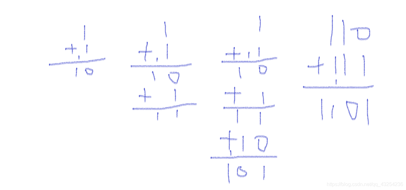 - 二进制的加法:1+1=10 1+1+1=11 1+1+1+10=100 110+111=1101