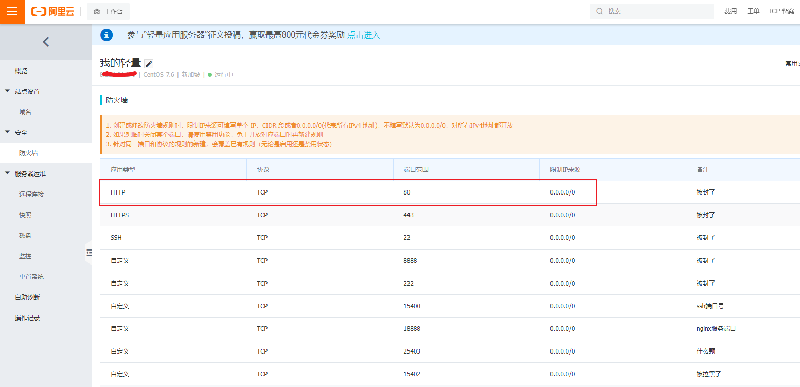 然后再查看一下端口,发现80端口已经开发,我心爱的小网站又回来了