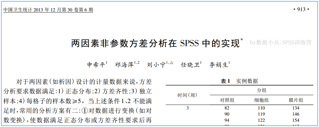 可惜啊,咱们常用的SPSS统计软件并没有提供Scheirer-Ray-Hare 检验,所以 SPSS是无法直接实现的。好消息是,一些科研工作者们已经开始尝试利用SPSS完成该检验方法。申希平,祁海萍等学者利用SPSS软件的个案排秩、计算变量、方差分析等菜单功能实现了Scheirer-Ray-Hare 检验,他们的 期刊论文标题为《两因素非参数方差分析在 SPSS 中的实现》,于2013年12月发表于《中国卫生统计》。