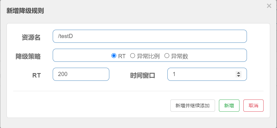 平均响应时间超出阈值且在时间窗口内通过的请求>=5,两个条件同时满足后触发降级;