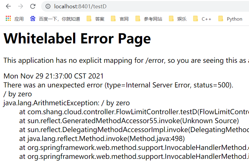 按照上述配置,单独访问一次,必然来一次报错一次(int m = 10/0),调一次错一次(错误占比为100%);而当开启jmeter后,直接高并发发送请求,多次调用达到我们的配置条件了,这时断路器开启(保险丝跳闸),微服务不可用,不再报错error而是服务降级了。