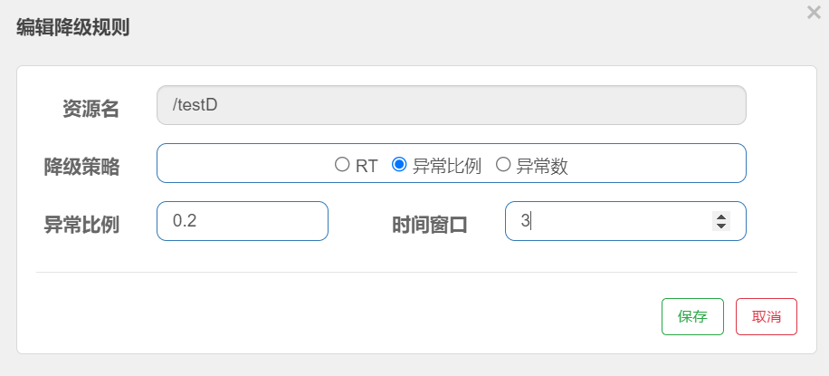 QPS >= 5 且异常比例(秒级统计)超过阈值时,触发降级;时间窗口结束后,关闭降级