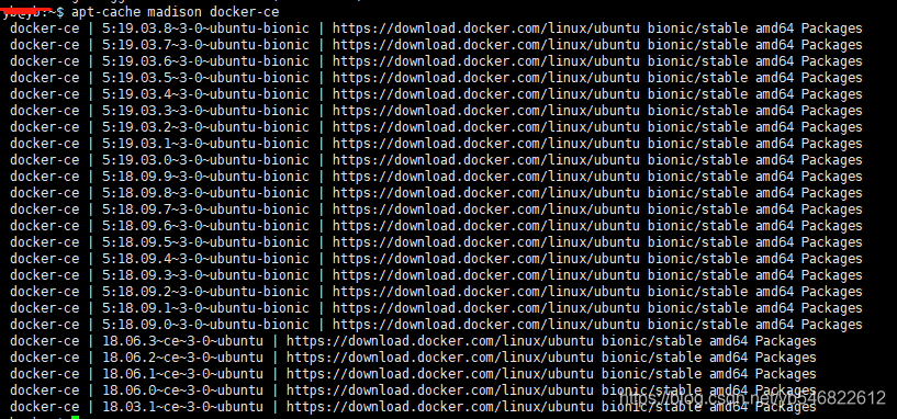 这里选择 5:19.03.8~3-0~ubuntu-bionic 列表中第一个版本,这只是个人建议,这个版本不是最新也不是最旧,其实使用起来差距不大,