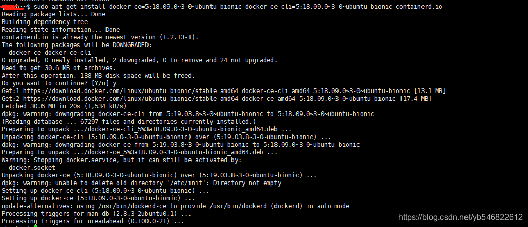 sudo apt-get install docker-ce=5:18.09.0~3-0~ubuntu-bionic docker-ce-cli=5:18.09.0~3-0~ubuntu-bionic containerd.io执行结果如下