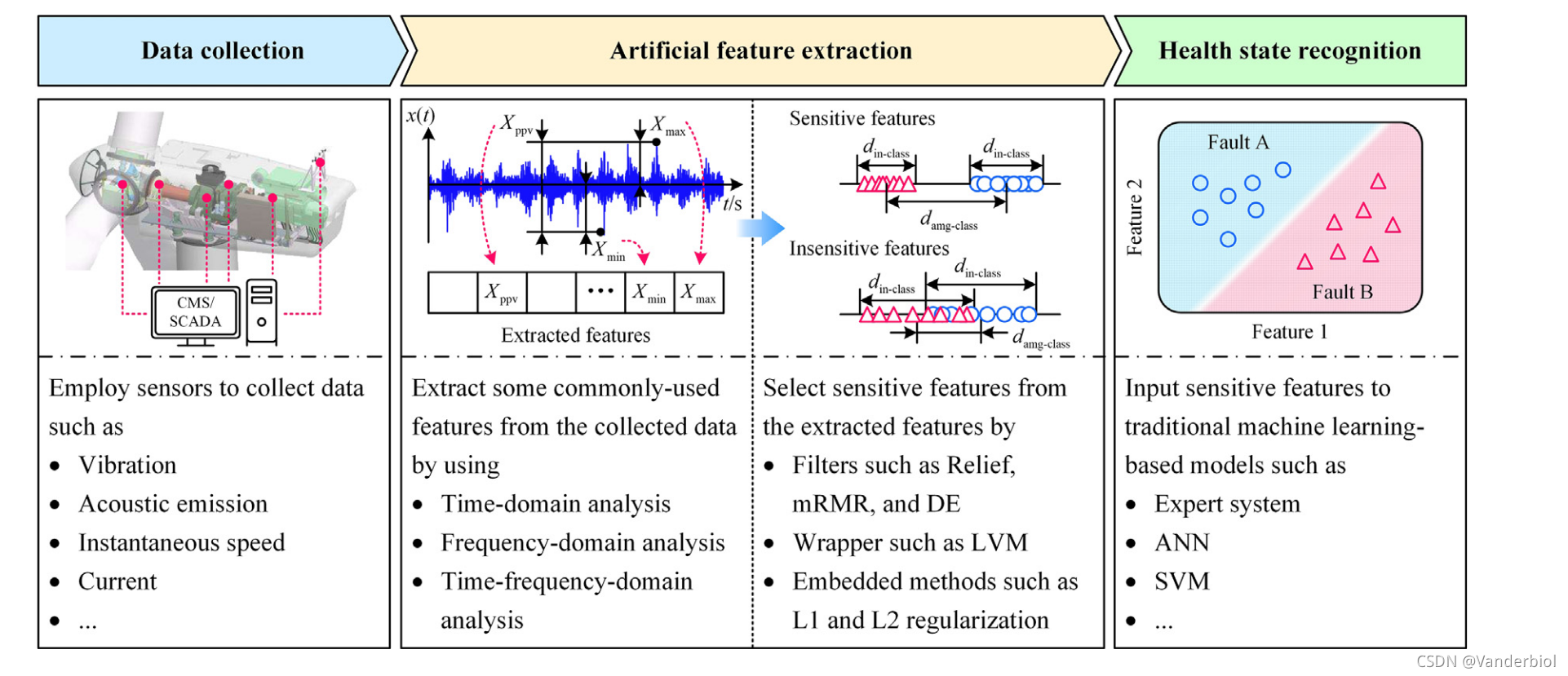在过去的故障诊断体系中,一些传统的机器学习理论,如ANN和SVM,被应用于机器故障诊断。诊断程序包括三个步骤,即数据收集、故障特征提取和状态识别,如图2.1所示。