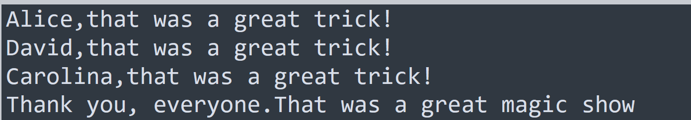 从上图可以看到,第一个打印是缩进状态,对于列表中的每个元素都进行了这句话的操作;而第二个打印没有缩进,就意味着没有参与循环,只打印了这句话。其次在第一句打印中还用到了之前字符串的title()方法,将字符串的首字母大写(有问题请参照之前的文章)。