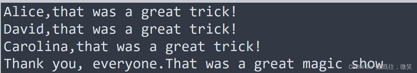 print(f"{magician.title()},that was a great trick!")