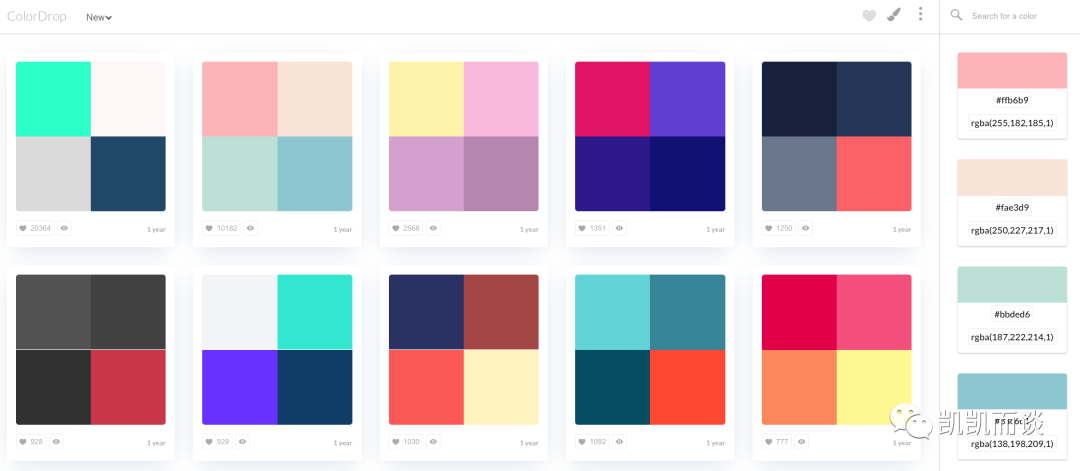 提供组合好的配色,点击右侧显示颜色值参数。可以搜索颜色供选择。