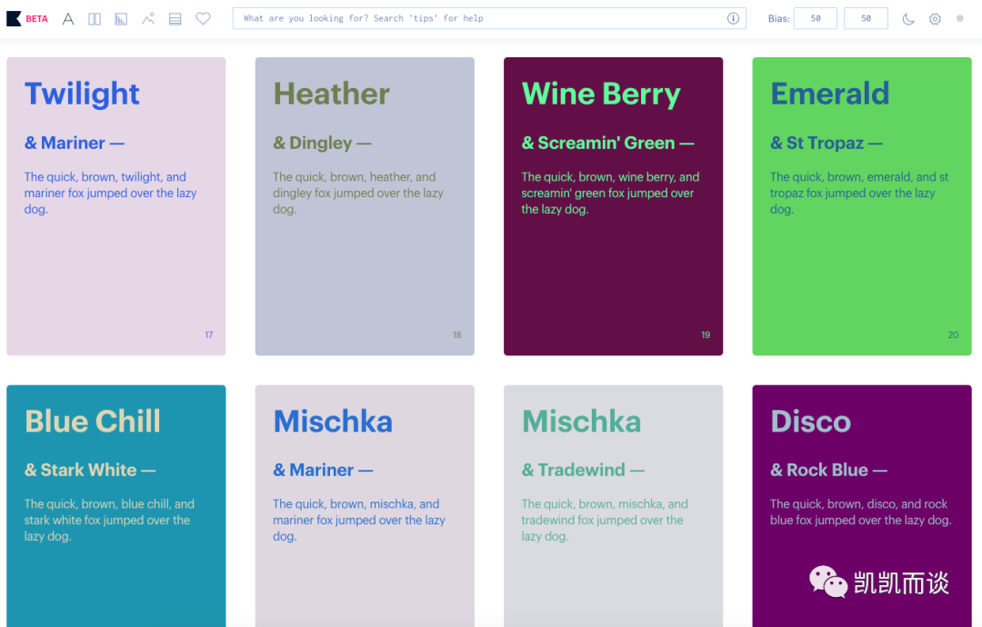 首先会提供一些你喜欢的颜色,选择后,会用AI算法的方式,生成颜色的组合供你选择和保存。可以说是利用比较新的技术来解决配色的问题。这种方式还是很有意思的。