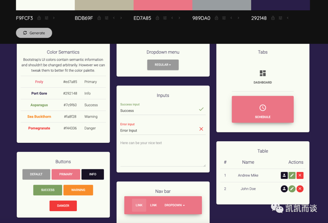 根据选择的配色组合,可以在线看到一些预设的样式,包括按钮、文字等,还是非常方便的。