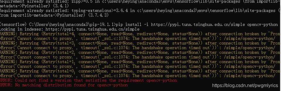 但是经过网上给的方法进行安装,还是出现错误,主要意思就是位于pypi.douban.com的存储库不是受信任的或安全的主机,正在被忽略。