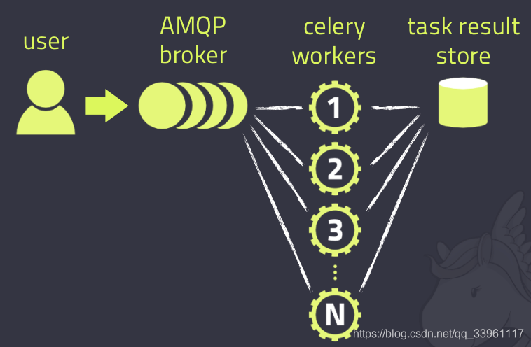 三大组成部分:消息中间件(message broker)、任务执行单元(worker)、任务执行结果存储(task result store)