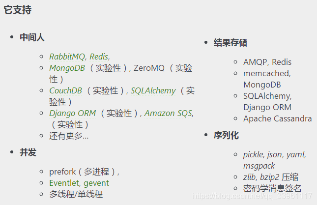 - Celery 几乎所有部分都可以扩展或单独使用。可以自制连接池、 序列化、压缩模式、日志、调度器、消费者、生产者、自动扩展、 中间人传输或更多。
