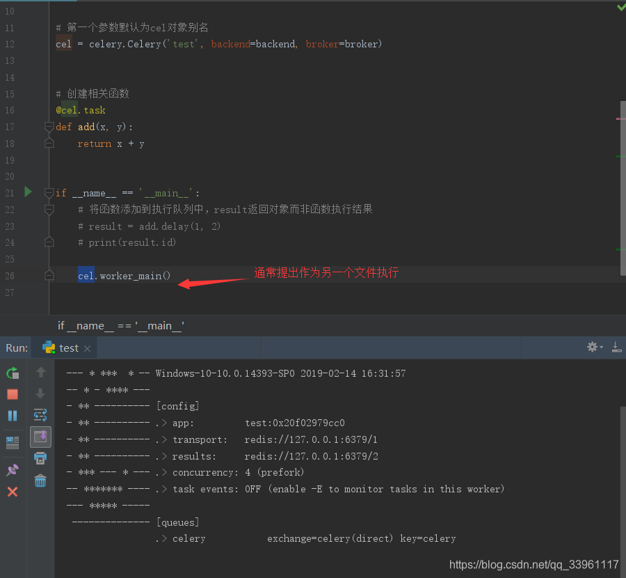- 通常woker的启动命令:celery worker -A test -l info