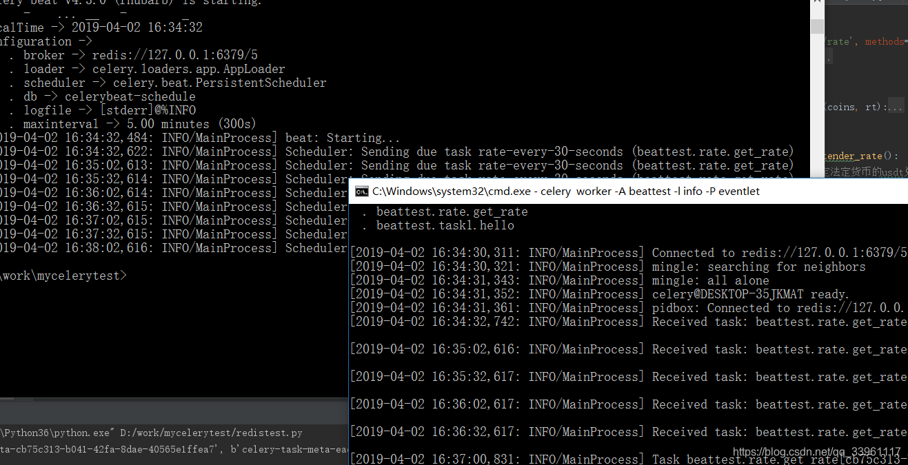 启动一个beat:celery beat -A 文件名或者包名 -l info 启动work执行:celery worker -A 文件名或者包名 -l info -P eventlet