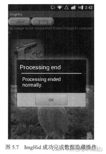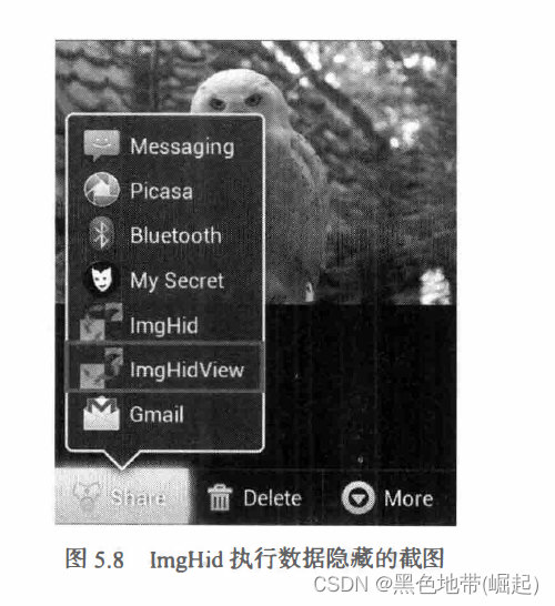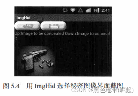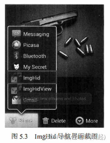 ImgHid的导航界面如 图 5.3所示, 在 Android Gallery 中选择 "ImgHid ” 选项即可开始进行数据隐藏操作。