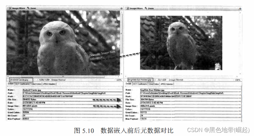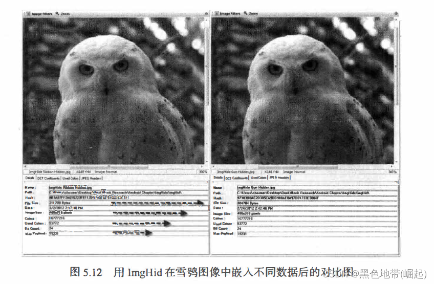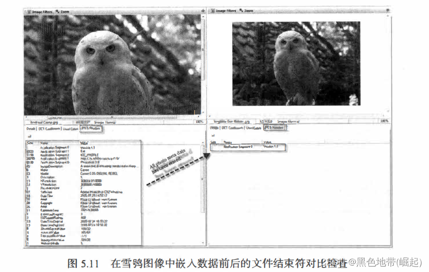 右侧经过数据嵌入处理的图像,也有个同样的文件标识符 FF D9", 但是, 在这个字符之后还有很多其他数据, 这就是我们用 ImgHid 嵌入的附加数据。