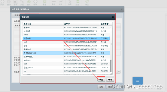 流程定义时添加表单过程:流程属性-表单设置中点击“添加表单”按钮,在表单列表中选取对应表单,如下图所示: