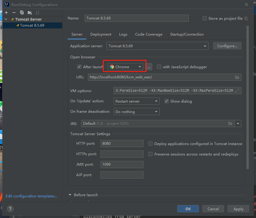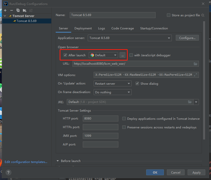 2、在Tomcat中配置打开浏览器的设置,将“After Launch”中的“Default”改为“Chrome”