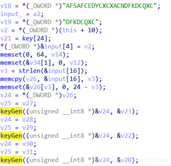 print hex(int(str(m[v9])))[2:8+2] + hex(int(str(m[v21])))[2:2+2]接着我们来分析覆盖后的函数,可以用IDC脚本直接将正确的函数数据patch到目标函数中,然后来分析。可以看到该函数连续调用了0x401000这个函数3次,进去看了后很复杂,估计是某种加密方式,用插件看一眼是DES