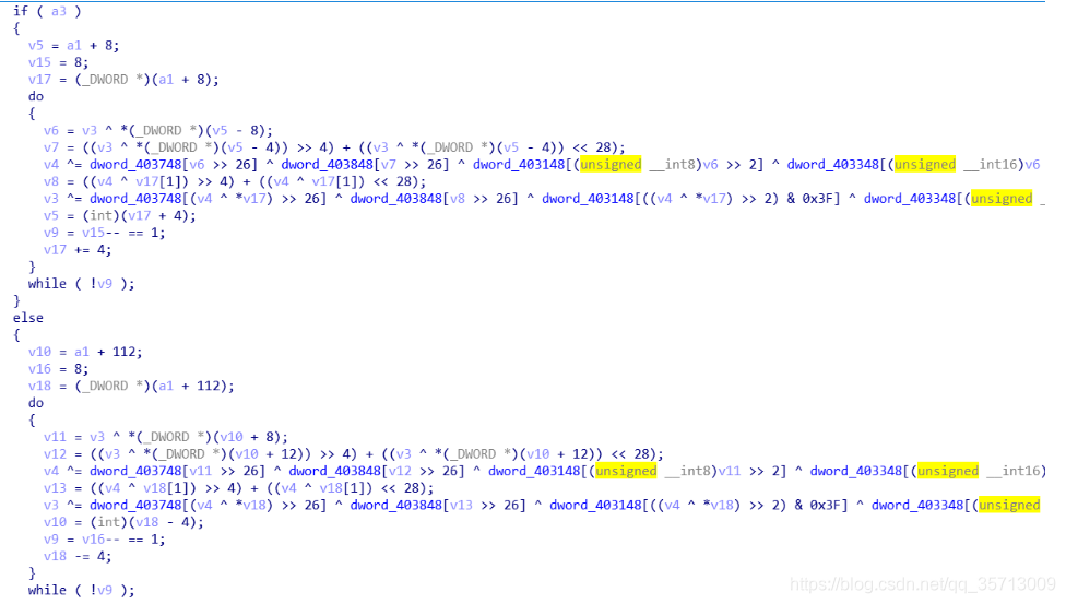 可以看到参数3为1时在这里子密钥每次增加4个dword即48位,为0时则是减少48位,由此可看出加密和解密的模式。