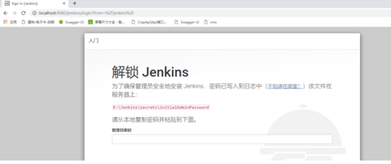 5.在浏览器输入本地jenkins地址127.0.0.1:8080/jenkins,出现下面页面,说明jenkins启动成功
