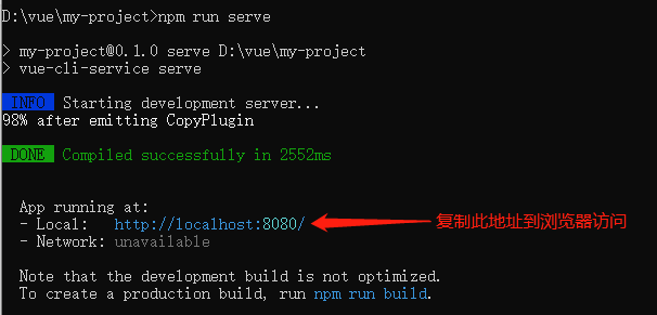 在项目包目录下开启cmd,启动项目包中的自带服务器npm run serve,成功后界面如下