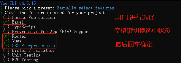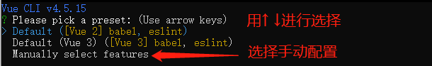 项目创建好之后,会出现以下窗口,用上下箭头选择手动配置,详细安装步骤看图中文字