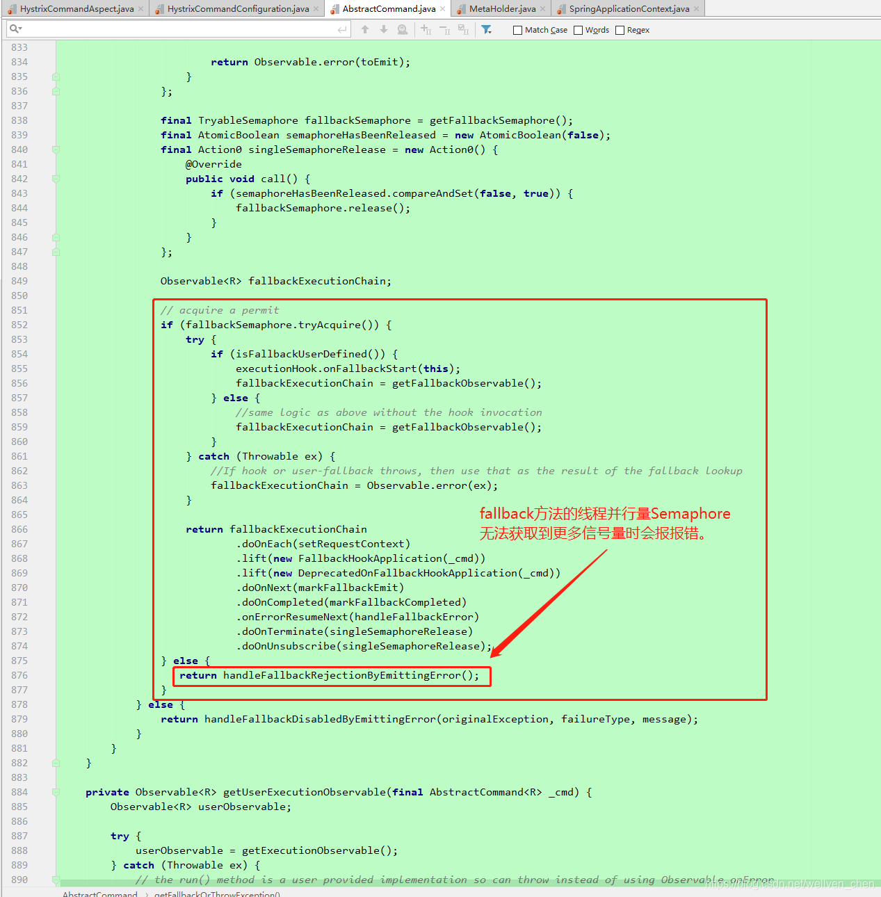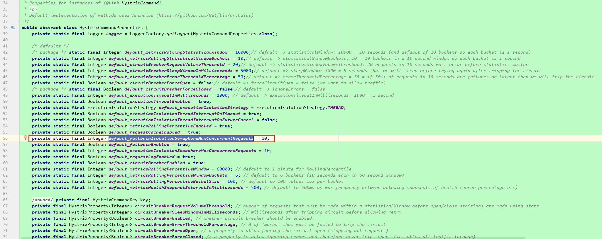 这个"default_fallbackIsolationSemaphoreMaxConcurrentRequests = 10" 的配置就是最终导致只有10个线程发生降级的"元凶"。我们先来看一下GITHUB上面对这个属性的描述:这个属性主要是来控制Hystrix降级并行的线程数,如果需要降级的线程并行数超过这个属性所设置的值,则会直接报上面HystrixRuntimeException的异常。一开始通过这个配置的名字来看,以为只是针对于Semaphore模式下的Hystrix的降级处理,结果在Thread模式下也会生效。。