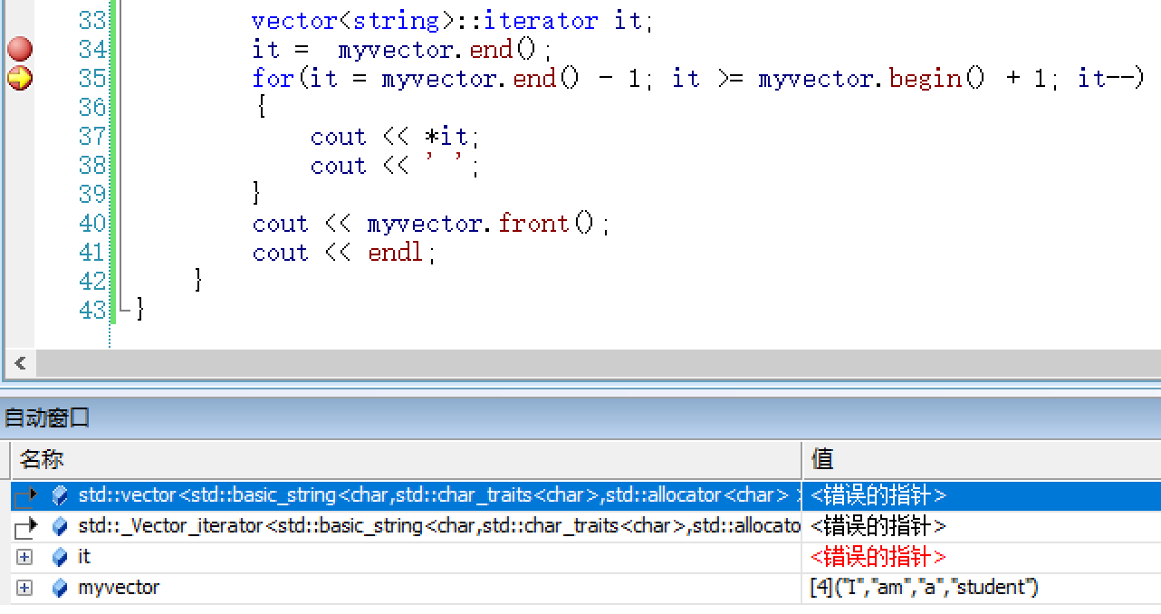 =======================================*/注:迭代器不能等于 end();比如 it = myvector.end(); 运行结果如下图,end()是一个错误的指针