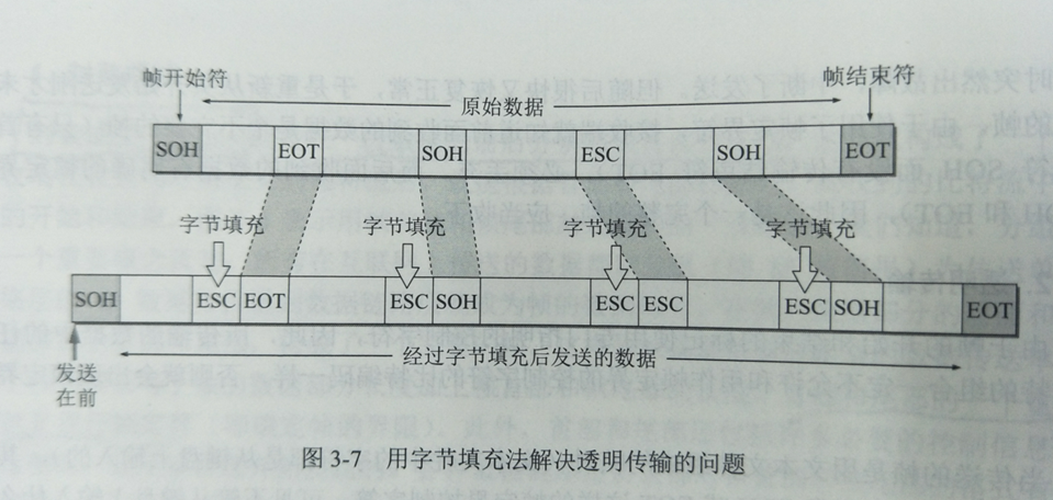 字节填充(字符填充):发送端的数据链路层在数据中出现控制字字符“SOH”或“EOT”的前面插入一个转义字符“ESC”(其十六进制编码是:1B,二进制是00011011)。而在接收端的数据链路层在把数据送往网络层之前删除这个插入的转义字符。