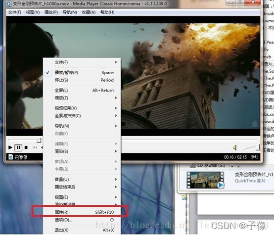 例如通过Media Player classic播放器打开一个.mov后缀格式的播放文件