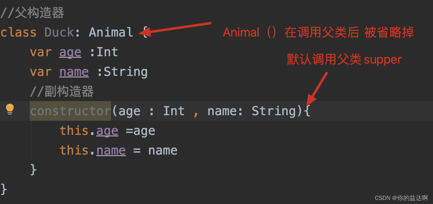 class Cat(var age:Int , var name :String ): Animal()子类继承父类 需要实现父类的构造器 也就是 Cat在继承Animal时 需要实现Animal默认的构造器