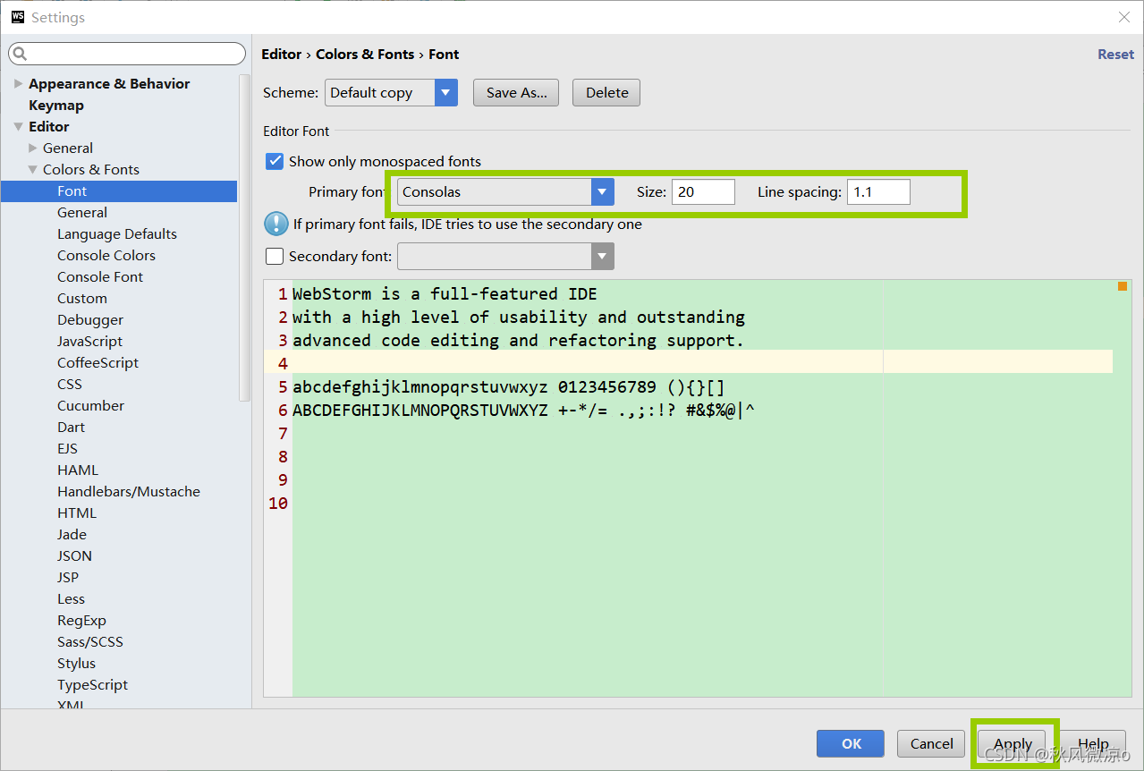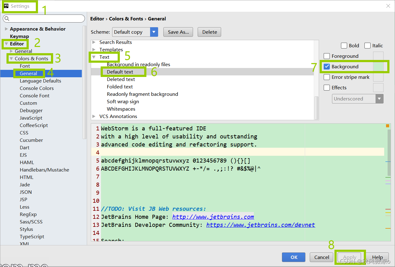1. 设置背景色:Text->Default text->选中Background,颜色置为C7EDCC