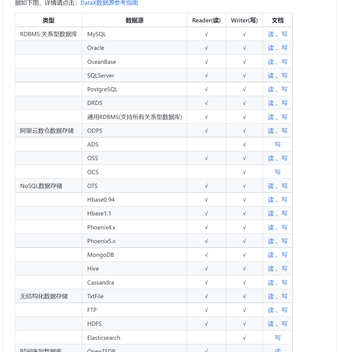 datax:阿里开源的产品,有开源和商业版两个版本。当前支持的数据库读写类型