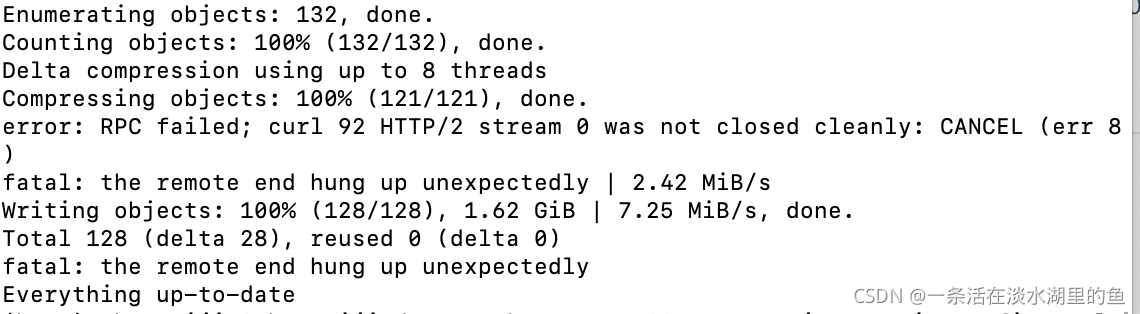 git config http.postBuffer 524288000然后如果还没有解决的话,就试试下边这个方案,我们可以看到报错信息提到了HTTP/2,于是乎解决思路就是换回HTTP1上传。上传之后再切换回HTTP2。
