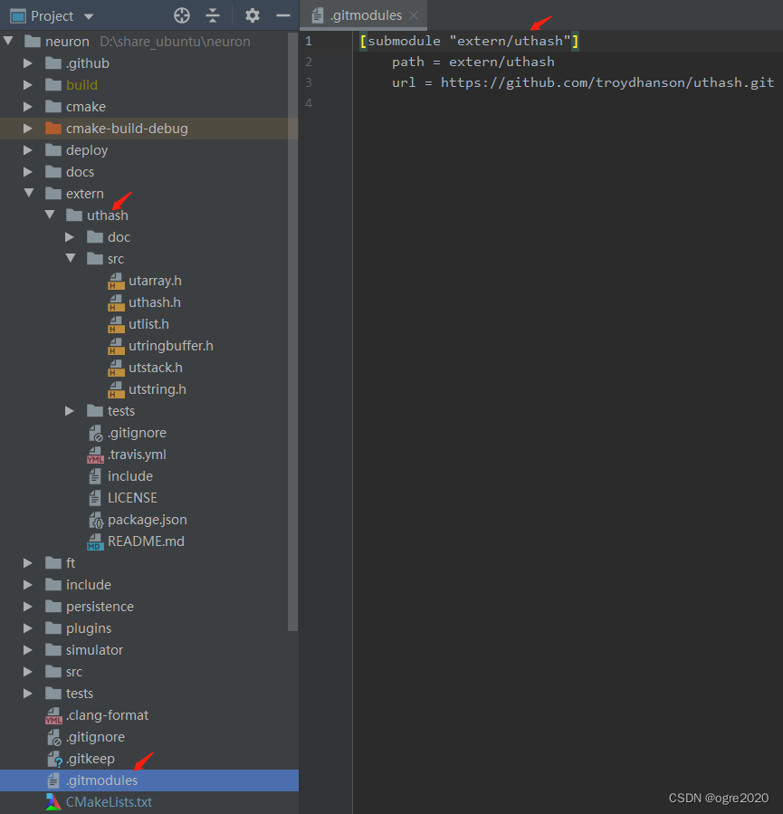 默认 extern/uthash目录中是空的,执行 git submodule update 后,会自动下载该子模块