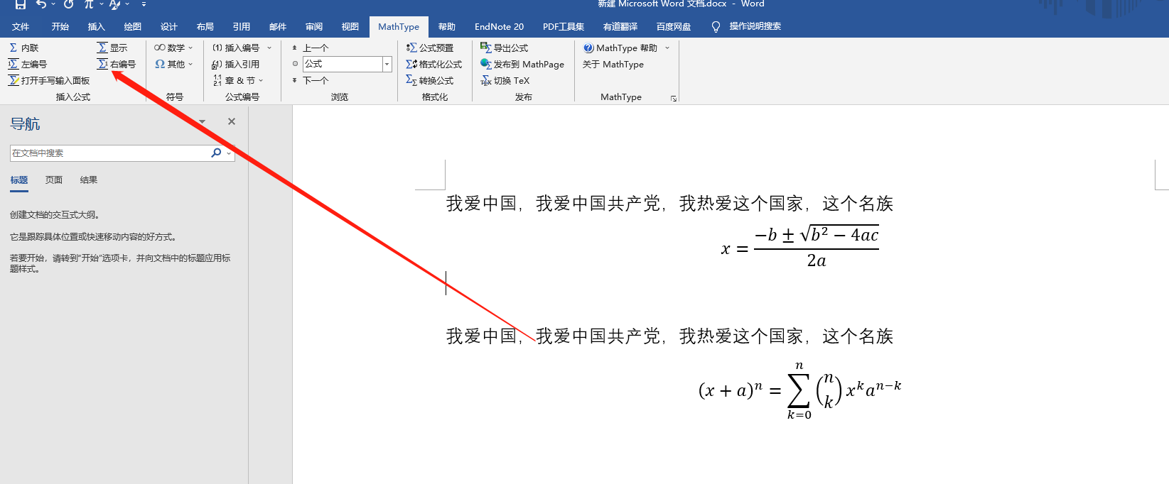 3 复制第一个公式,点击 word中的 mathtype 点击右编号