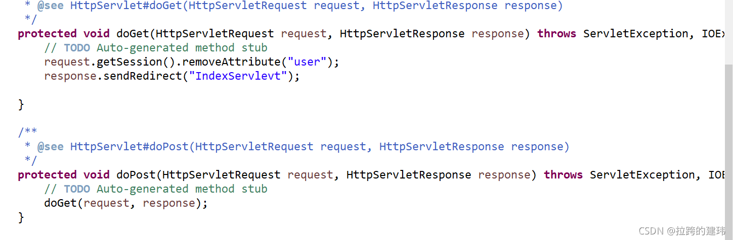 4.创建LogouServlet类会将用户信息移除,并转跳到首页: