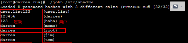 编译完成后,系统会在../run目录下生成John的可执行文件,使用John破解shadow文件的命令及结果