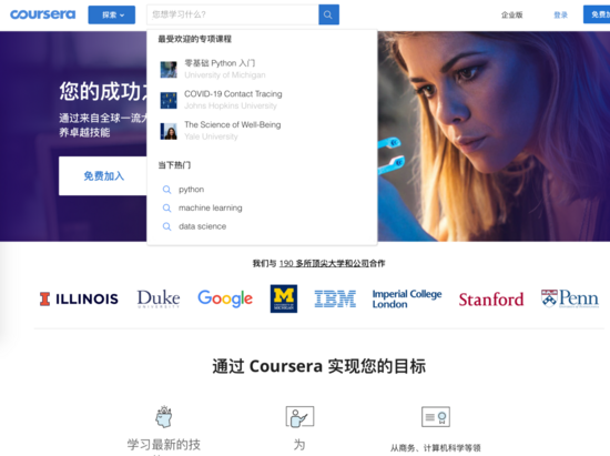 Coursera是由美国斯坦福大学两名计算机科学教授创办的一个在线教育网站,提供了大量优质的开放式线上公开课,包括计算机科学、数据科学、语言学习等几个方面。
