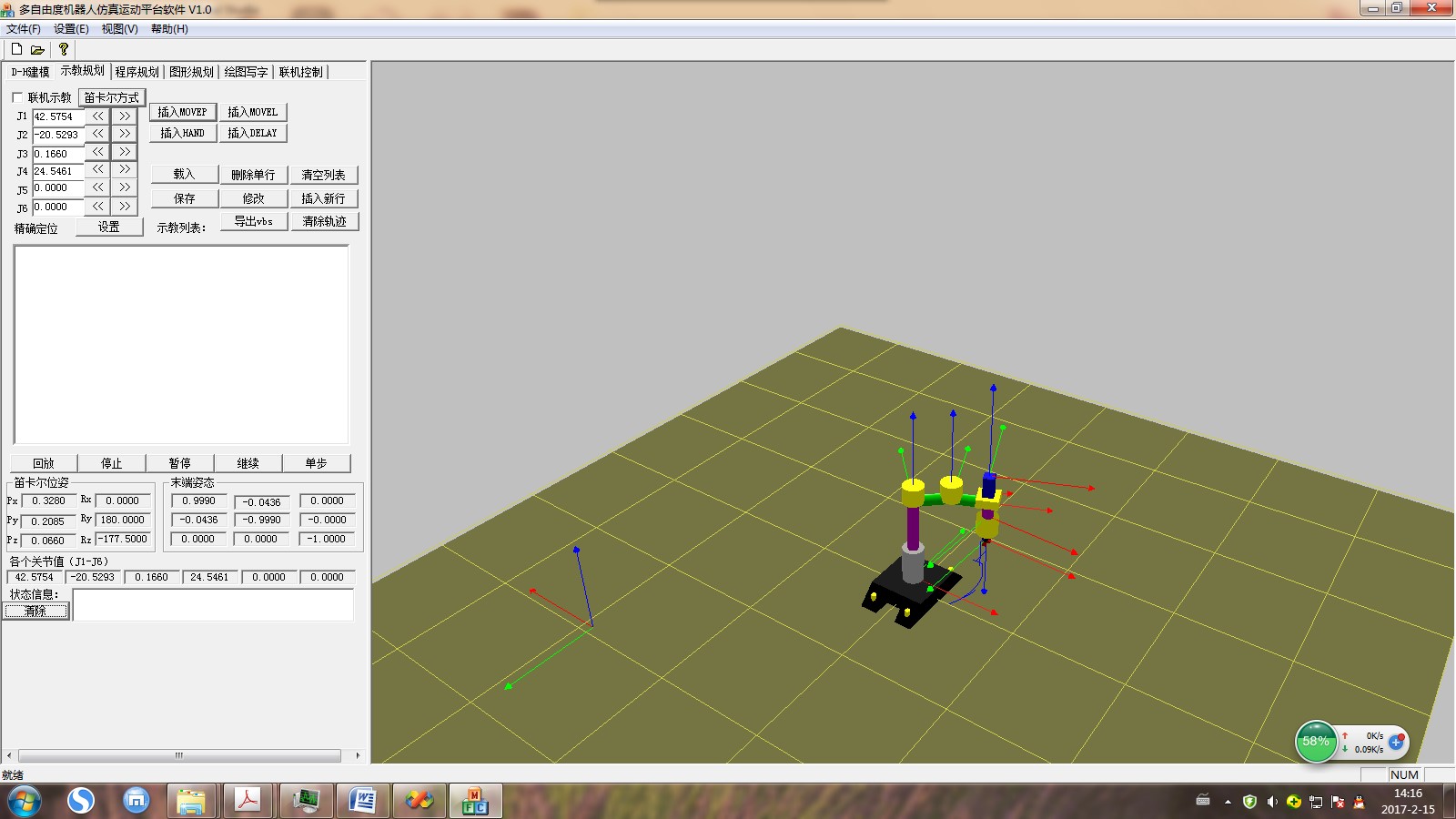 机器人仿真运动时,其笛卡尔位姿和机器人末端姿态均显示在界面上,会同机器人各个关节角度值可实时进行显示。